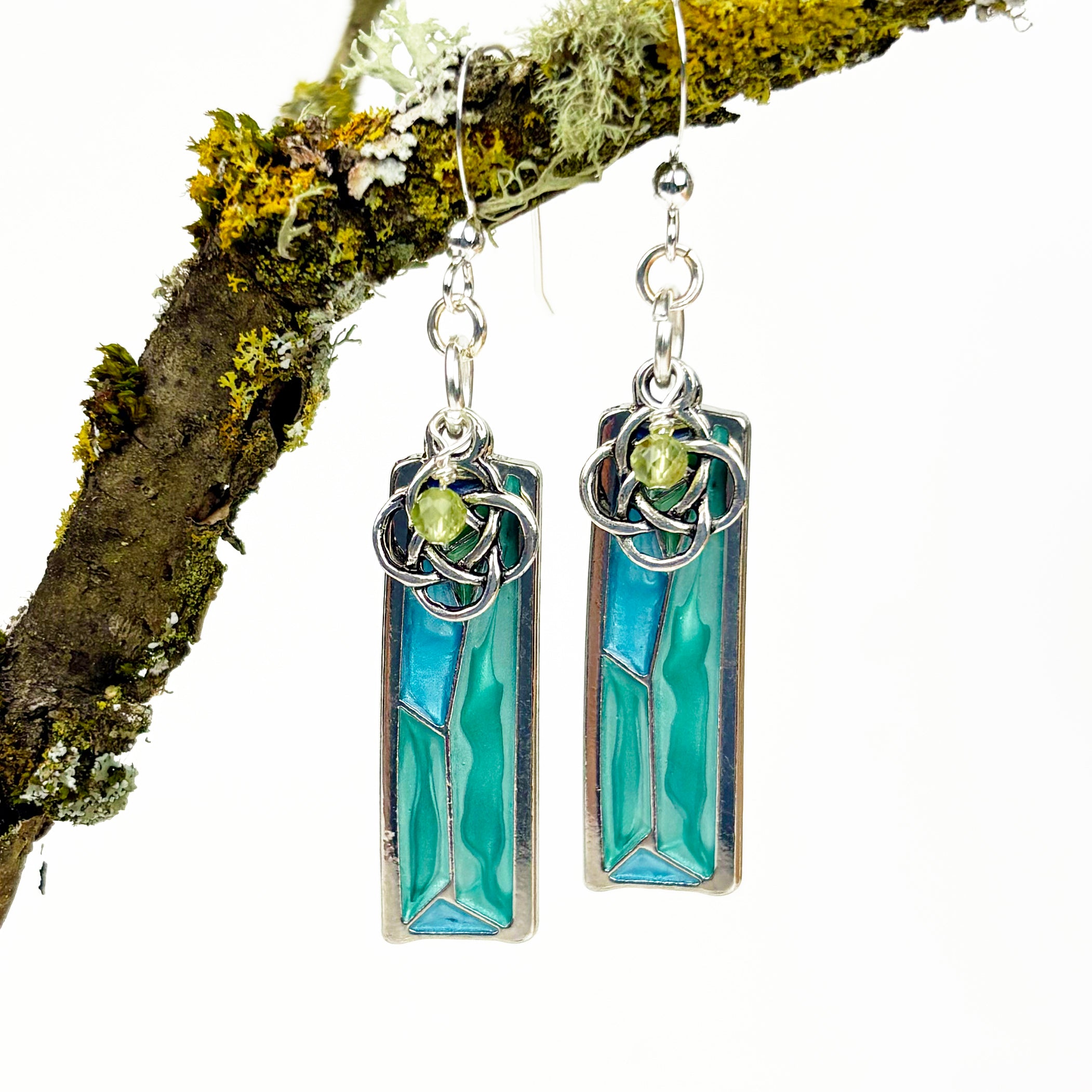 Angled windowpane with Celtic knot and Peridot gemstoneAngled windowpane with Celtic knot and Peridot gemstone