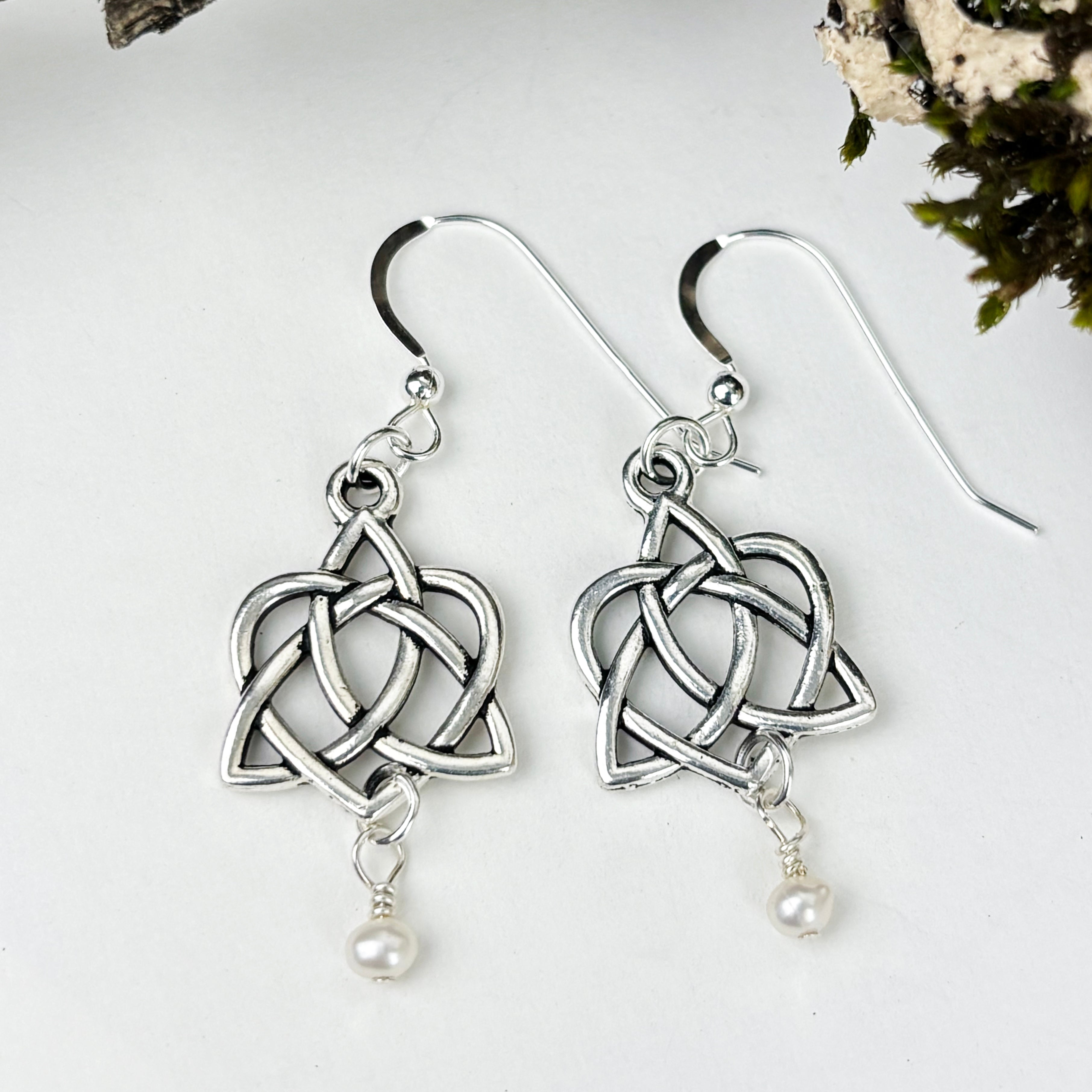 Description..... Trinity knot with intertwined heart, sometimes referred as the Sisters Knot, is beautifully adorned with a 4mm Freshwater pearls. Earrings or Pendant. Finished on sterling silver French ear wires and 18" chain.