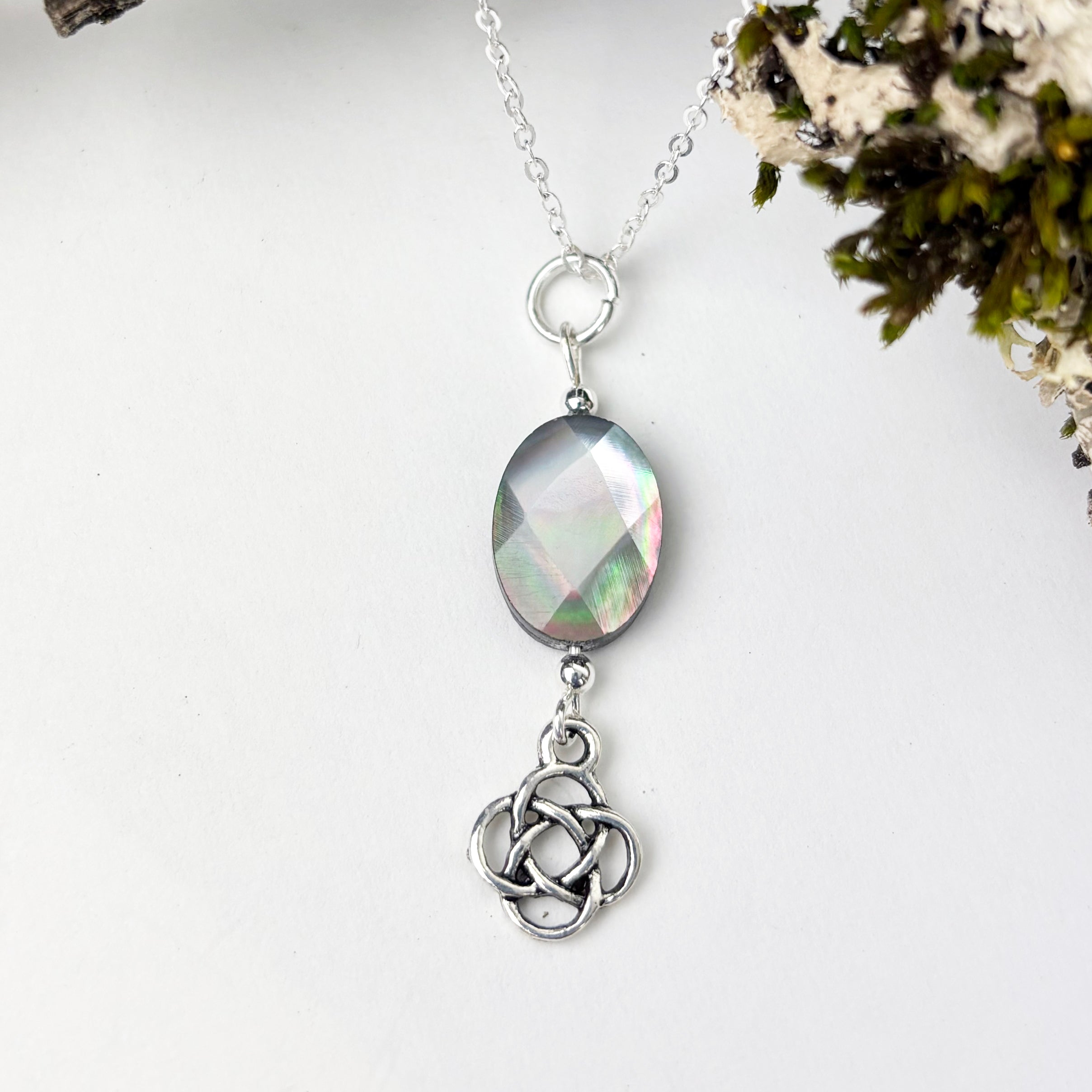 Faceted Black Mother-of-Pearl with round Celtic Knot drop earrings or pendant. Finished on sterling silver French ear wires and 18" chain.