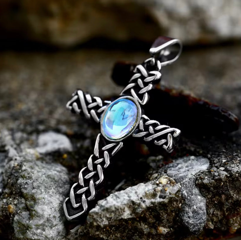 Celtic Knot Cross with Center of Soft Blue Opalite Pendant