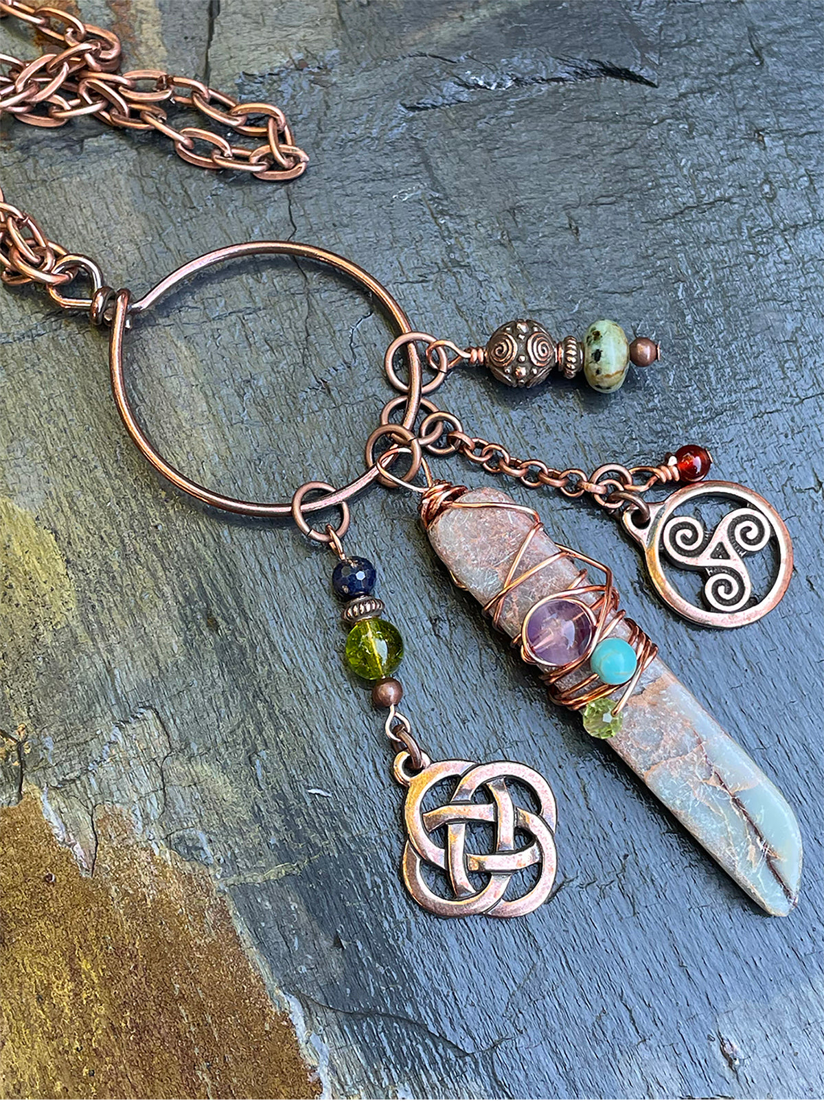 This gorgeous copper charm-keeper with Jasper focal is adorned with a copper wrapped Terra Jasper, Peridot, Carnelian, a round Lugh Celtic knot, and a Triskele symbolizing the Goddess. A beautiful and meaningful addition to any Celtic jewelry collection! Adjustable 32" red copper chain. Boxed with meaning of the Celtic symbols and Mythology of the Goddess Danu,