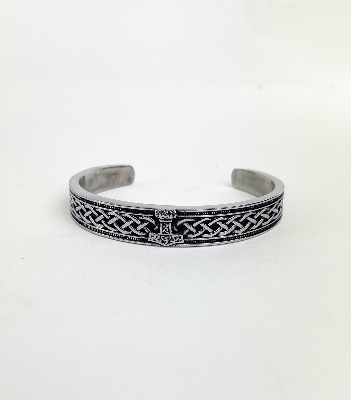 Stainless steel men's cuff bracelet with Thor's Hammer and Celtic knots. An eye-catching piece of jewelry with mythical details that make it truly unique. Show off your style and embrace your Norse heritage with this must-have bracelet.
