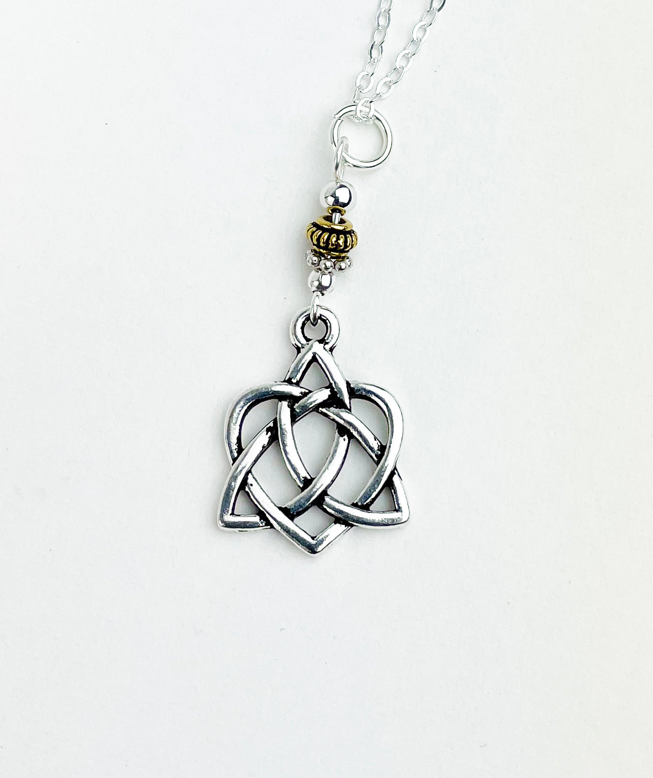 Celtic Trinity Knot with intertwined heart with beaded gold details. Earrings or Pendant. Finished on sterling silver French ear wires and 18" chain. Comes with a card with meaning of the Celtic symbol and power of the gemstone.