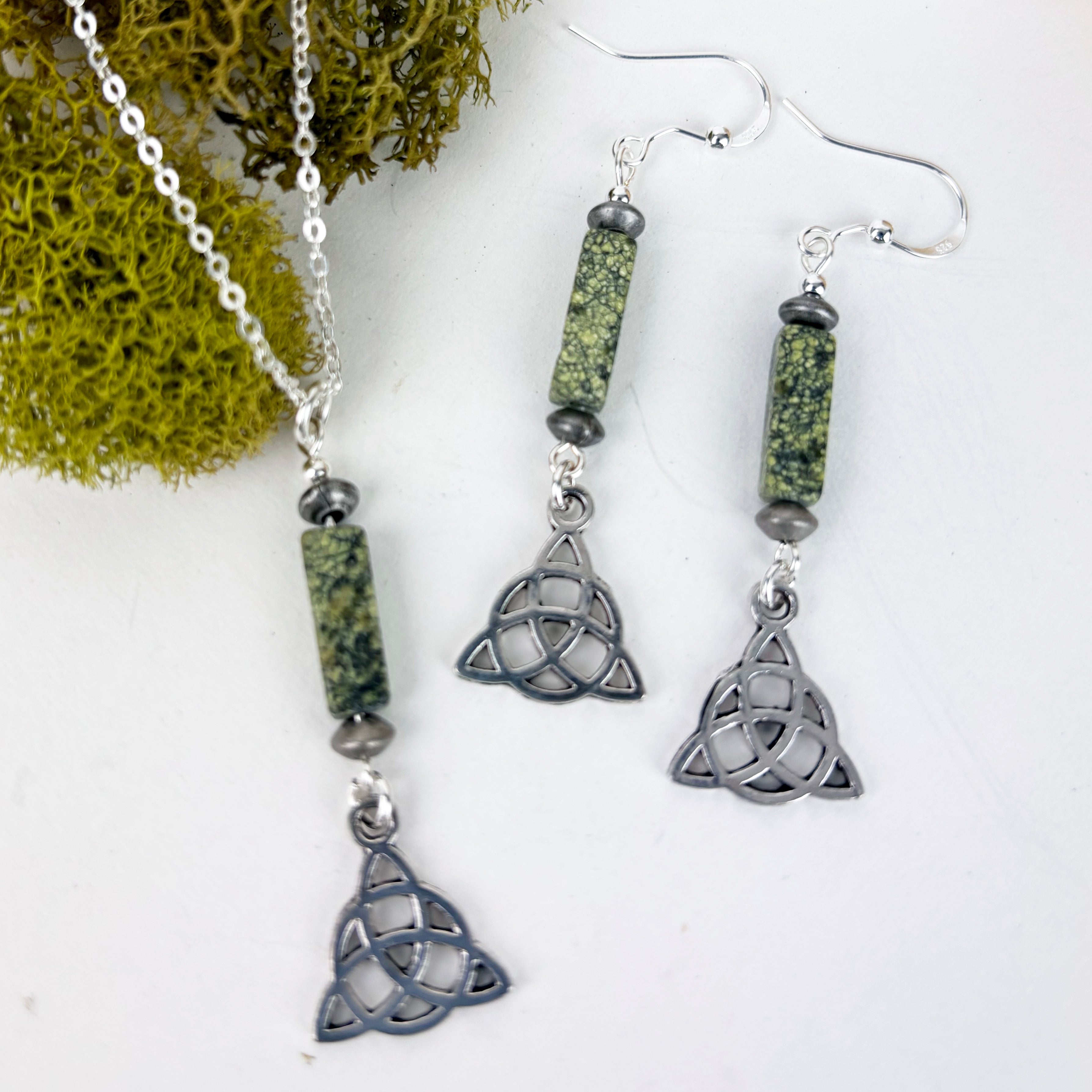 Square columns of Serpentine with Celtic Triknot. Earrings or Pendant. Finished on sterling silver French ear wires and 18" chain. Comes with a card with meaning of the Celtic symbol and power of the gemstone.