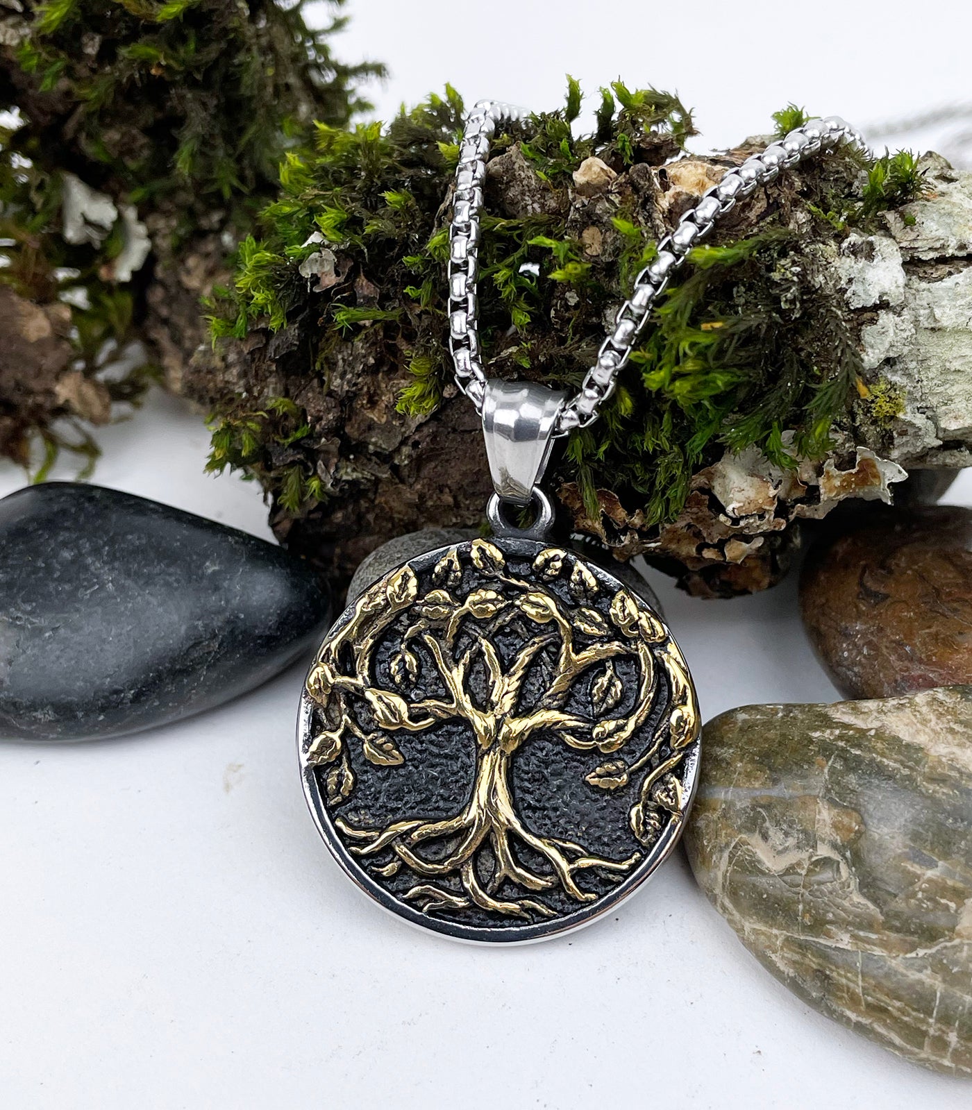 This Tree of Life pendant features spiritual symbolism with its intricate Celtic design and gold details. Crafted from stainless steel, it's a unique piece perfect for those who seek a meaningful accessory.