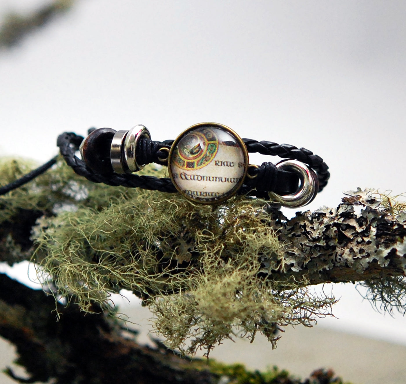 The coiled Celtic artwork and letters in Latin is brought to life under a glass domed cabochon held in a bezeled setting is adorned with antique silver, gunmetal and rich brown wood side slide beads on black braided and flat bands. Finished with an adjustable slide closure that makes this bracelet easy to put on and very comfortable to wear. Adjustable 6.5" to 9.5" approx.